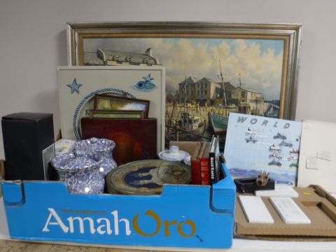 A box of blue and white storage jars, pottery wall panel, miniature cricket bat, George VI commemorative tin, books, signed balled eagle Jim smith story etc