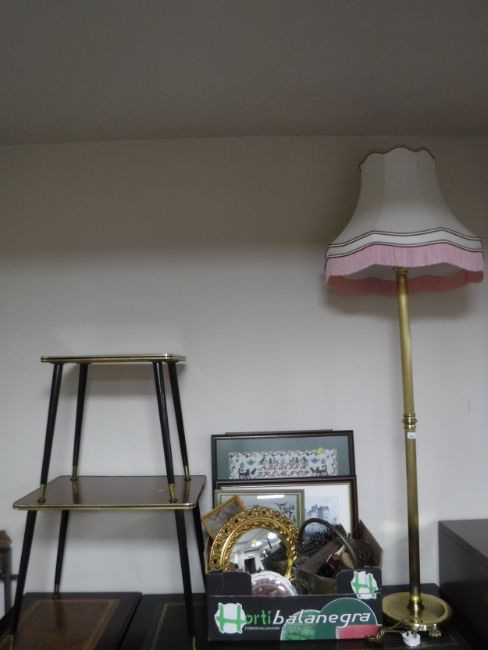 A brass standard lamp with shade together with a nest of two tables and box of framed needlework, gilt porthole mirror, plates, coal bucket etc