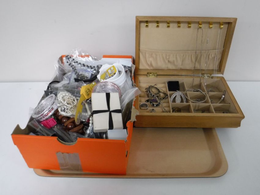 A tray of three boxes of a large quantity of costume and sterling silver jewellery