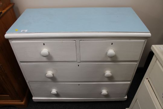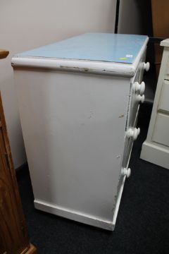 83cm high by 90cm wide by 44cm deep. Later melamine top. On modern plastic castors. Scuffs and scratches, ideally needs re-painting.
