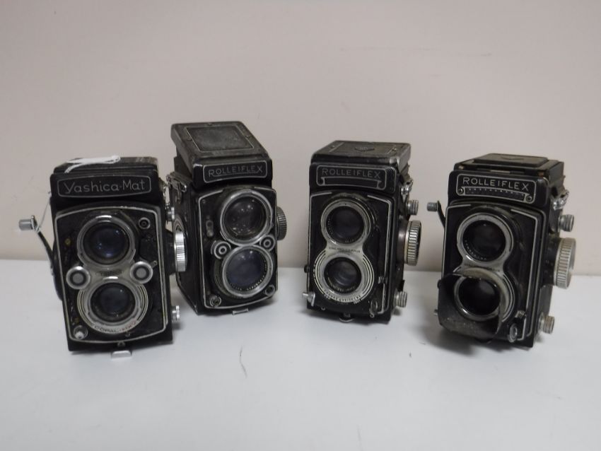 A Yashica-Mat Copal-MXV together with three Rolleiflex Franke & Heidecke Synchro Compur cameras Carl Zeiss Nr 3830723, Nr 4122298 and Schneider Kreuznach Xenotar 3853499. (4)