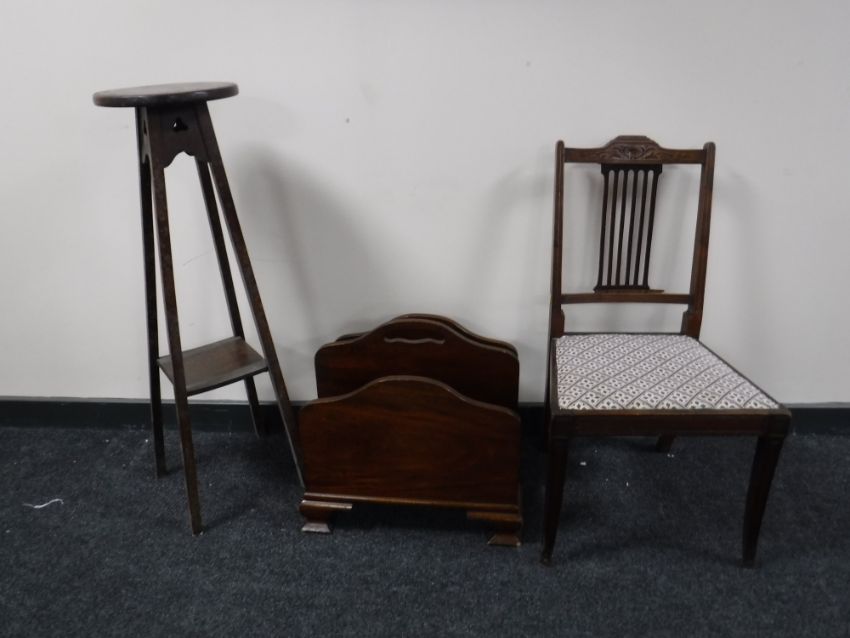 An antique mahogany bedroom chair (a/f) together with an Edwardian mahogany magazine rack and an oak plant stand