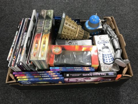 Three boxes of Dr Who related items including DVDs, books, toys, together with Dr Who wall canvas and two framed prints