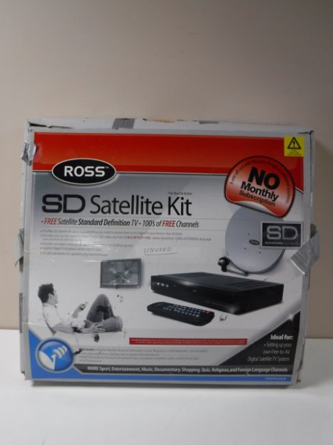 A boxed Ross SD satellite kit and a Steepletone radio