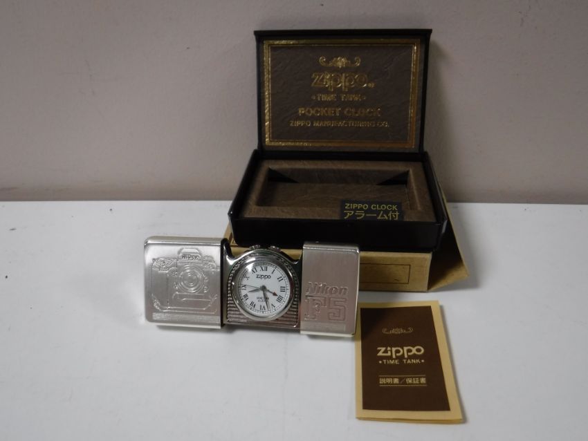 A rare Zippo "Time Tank" pocket clock, 1996, manufactured for Nikon, for their F5 camera, in original cellophane, with original instruction pamphlet, in original brown plastic box, in original card outer box.