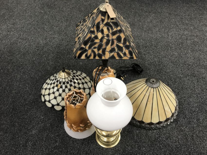 A brass oil lamp with glass chimney and shade, Tiffany style table lamp, two further shades, table lamp etc