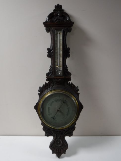 An early 20th century carved oak cased barometer by F. Robson & Co of Newcastle with silvered dial
