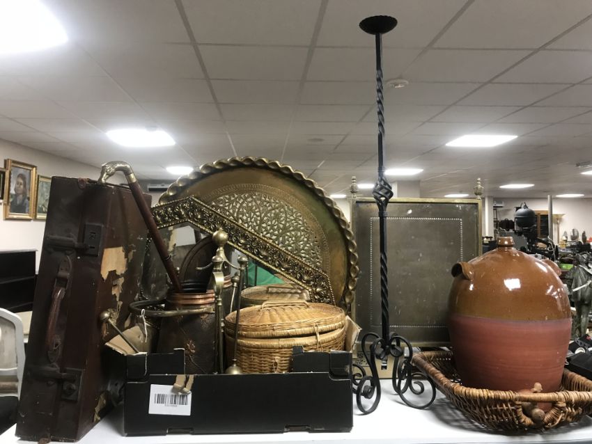 A vintage luggage case and a box of brass charger, brass framed mirror, copper coal bucket, companion set, wicker baskets, candle holder, fire screen and a glazed ware pot