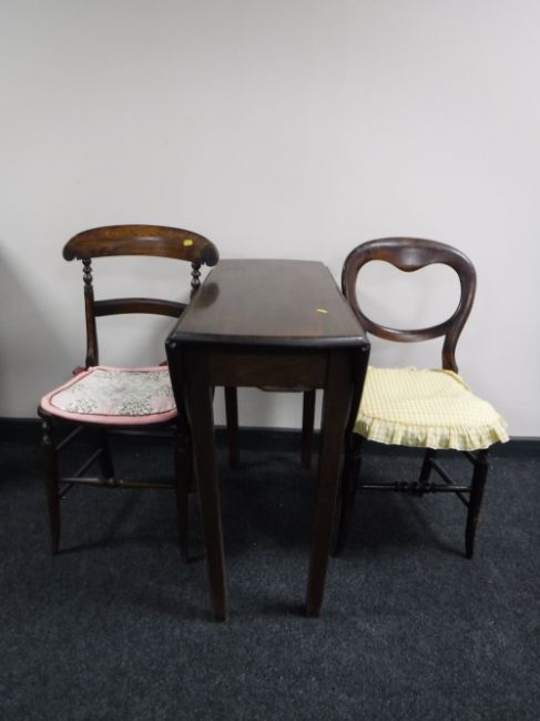 An antique mahogany drop leaf kitchen table together with a balloon back chair and one other