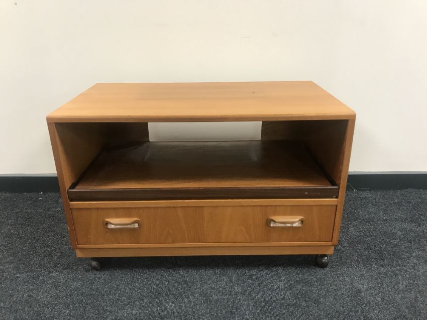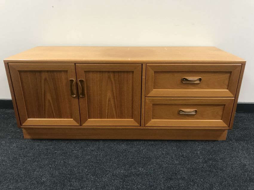 A teak entertainment stand fitted a drawer together with matching low sideboard