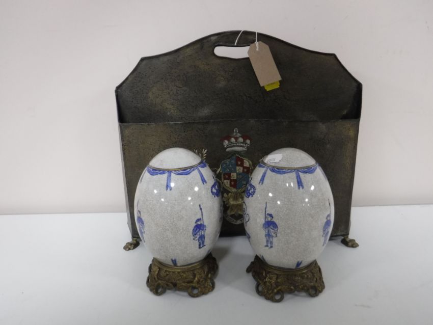 A metal magazine holder with armorial crest, together with a pair of blue and white decorative eggs on metal stands
