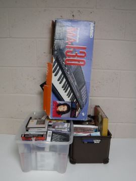 A boxed Casio electric keyboard together with a box of 7" vinyl singles and a box of assorted DVD's and CD's