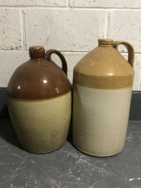 Two antique pottery flagons, one bearing advertisement Taylor & Lees Wine and Spirit Merchants, Oldham