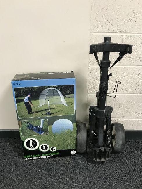 A golf bag containing a quantity of assorted irons and drivers together with a folding golf trolley and a boxed golf ball dispenser and driving net