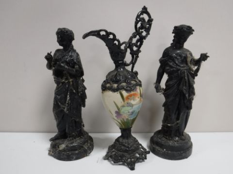 A pair of spelter figures on marble bases together with a spelter and china hand-painted ewer