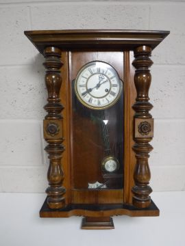 An early 20th century mahogany cased eight day wall clock with enamelled dial