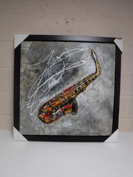 Two framed oil relief panels depicting a saxophone and a violin with bow