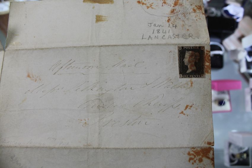A collection of antique letters, many with penny red and one with a penny black stamp