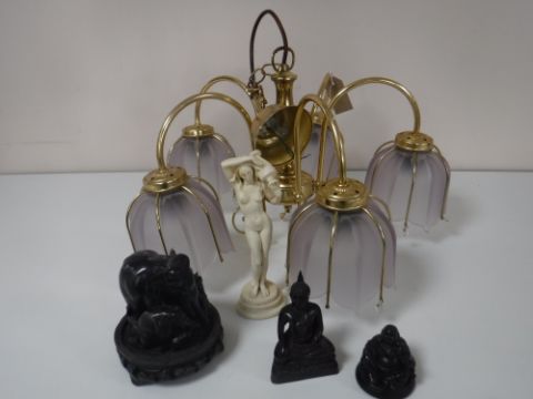 A brass five way light fitting with glass shades together with three Eastern hardwood figures and a figure of a maiden