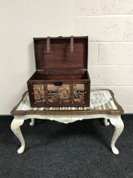 A mahogany Queen Anne style glass topped shabby chic coffee table together with a contemporary leather bound trunk