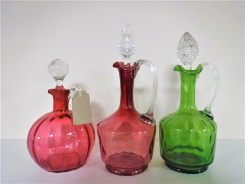 Three antique coloured glass decanters