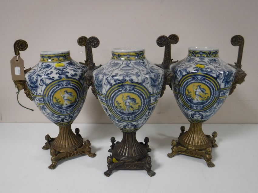 A trio of ormolu mounted blue and white decorative urns