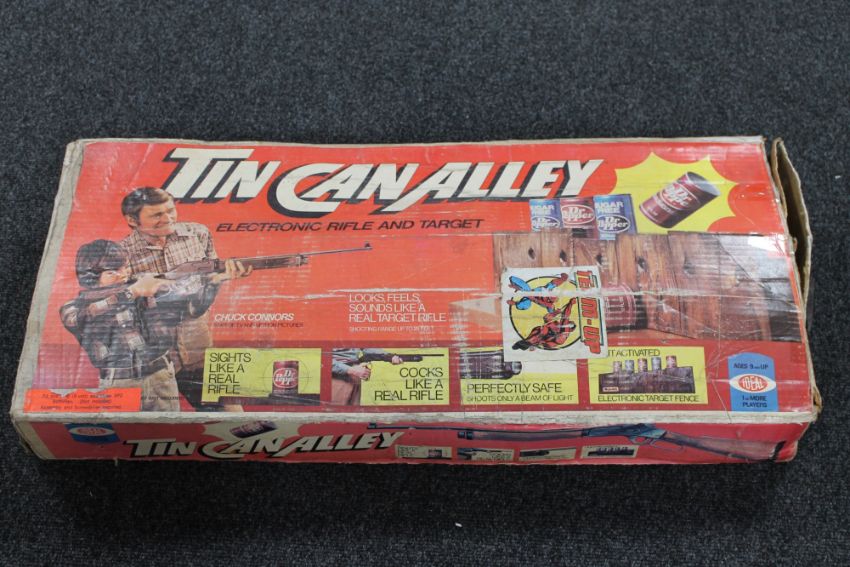 A boxed Ideal tin can alley electric rifle target game