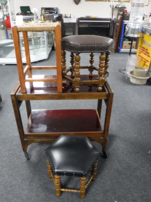 A two-tier dumb waiter trolley together with a rush seated stool and two hexagonal oak leather upholstered stools