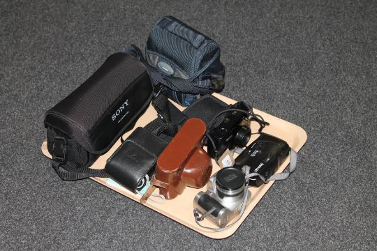 A tray of assorted cameras and cases including a Kodak easy share Z710 digital camera etc