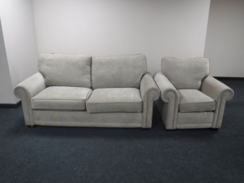 A two-seater bed settee and armchair upholstered in a beige fabric