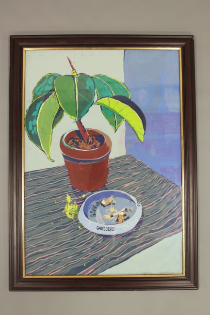 Christine McArthur RSW RGI (Scottish born 1953) : still life of a plant pot and an ashtray, oil painting, signed, 41 cm x 59 cm