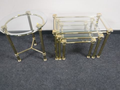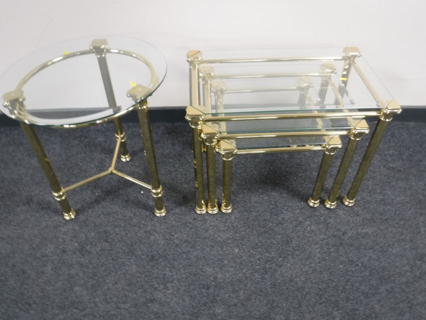 A nest of three brass and glass tables together with a matching brass and glass circular lamp table