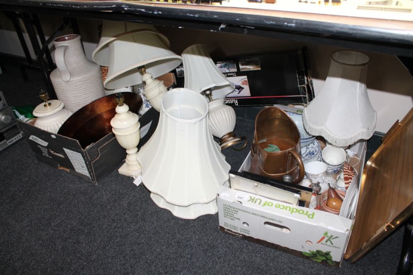 Two boxes of table lamps, West German vase, blue and white china, Russell hobs hostess tray etc