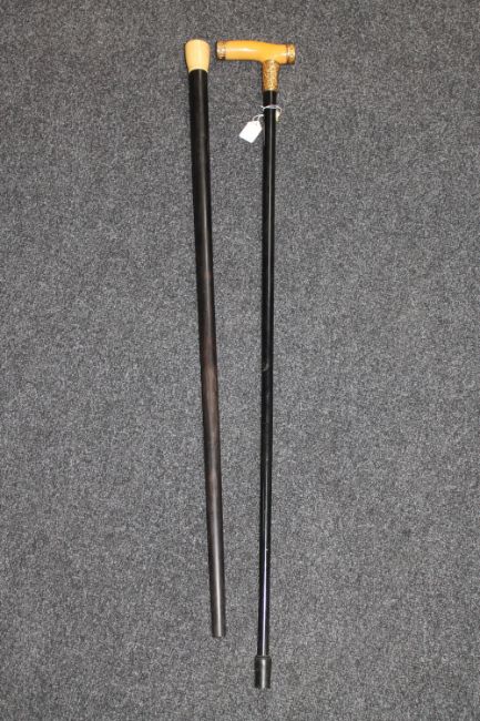 Two nineteenth century Gentleman's walking canes, one with 18ct gold plated mounts the other with ivory pommel. (2)