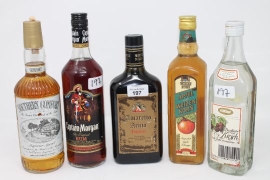 Five bottles of alcohol : Amaretto Arino Liqueur, Captain Morgan Rum, Southern Comfort Liqueur, Apple Schnapps and Rutter Kirsch. (5)