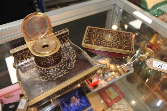 A Victorian style inlaid rosewood and brass mounted ink stand with blotter. (2)