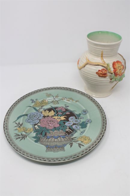 A Clarice Cliff Ophelia Newport Pottery plate together with a Clarice Cliff ribbed vase