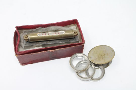 A scratch built brass live steam model together with a boxed miniature brass level and eye glass