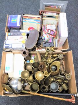 Two boxes containing 45's, brass ware, cased binoculars, audio books, playing cards etc