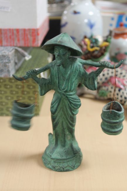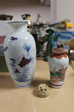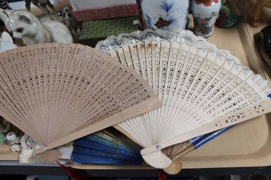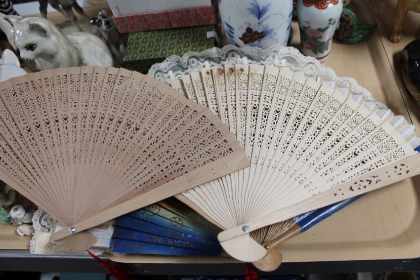 A tray of Oriental fans, boxed Great wall of china scent bottles, vases etc