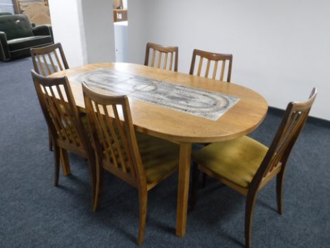 A mid twentieth century teak tiled topped pull out dining table with leaf together with six G-plan chairs