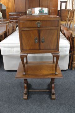 A walnut double door bedside cabinet fitted with a drawer together with an oak refectory coffee table on carved base