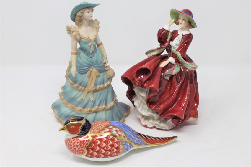 A Royal Doulton figure Top- o' the hill HN1834 together with a Coalport age of elegance figure and a Royal Crown Derby paperweight - Pheasant