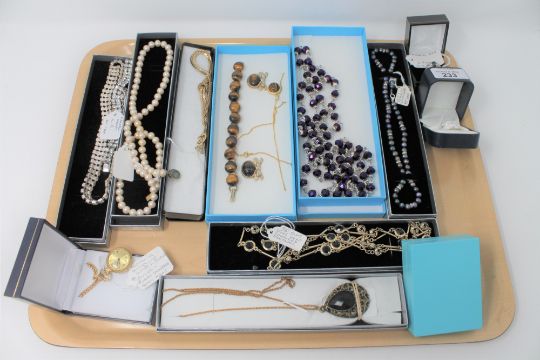A good collection of costume jewellery to include a suite of Tiger's eye necklace earring and bracelet, 18ct rolled gold necklace, 'Buler' watch (working), grey pearl necklace with 925 clasp, dress rings etc. (Q)