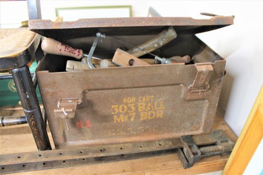 A metal ammunition box, containing a quantity of assorted hand tools, vintage leather cased tape measure, together with two sash clamps