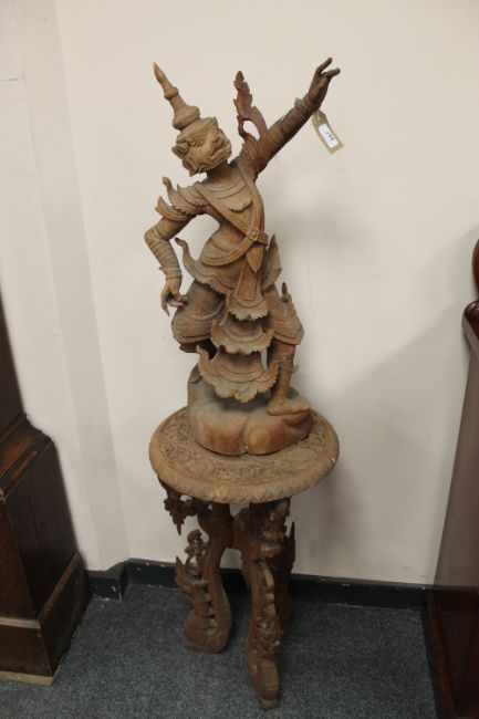 A carved eastern occasional table with hardwood deity figure, height 134 cm. (2)