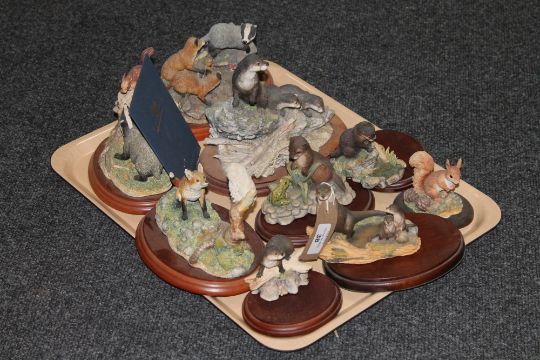 A tray containing nine Border Fine Arts figures, wildlife on wooden stands