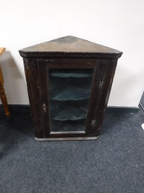 An antique oak glazed door hanging corner cupboard