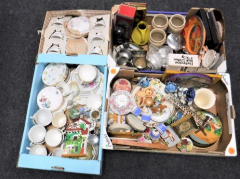 Three boxes containing assorted tea china, figurines, storage jars, vintage tins, together with a boxed Gainsborough china tea service