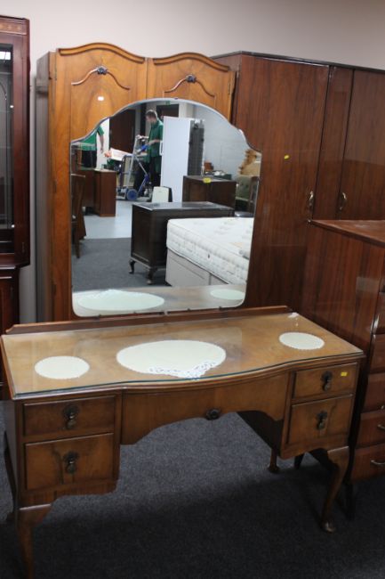 A figured walnut double door wardrobe together with a Queen Anne style dressing table